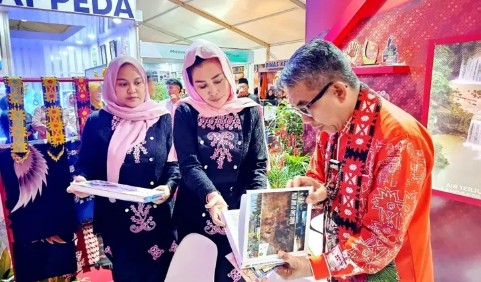 Bupati Kutai Timur bersama Wakil Bupati tampak antusias saat berkunjung ke stand Dinas Pariwisata. Keduanya disambut hangat oleh Kepala Bidang Pemasaran Dinas Pariwisata Kutim, Yunitha Ronting, SE., M.Si, yang dengan penuh semangat memperkenalkan beragam daya tarik wisata yang ada di Kutai Timur. Kekaguman pun terlihat ketika Bupati dan rombongan menyaksikan langsung berbagai inovasi dan kreativitas yang ditampilkan.